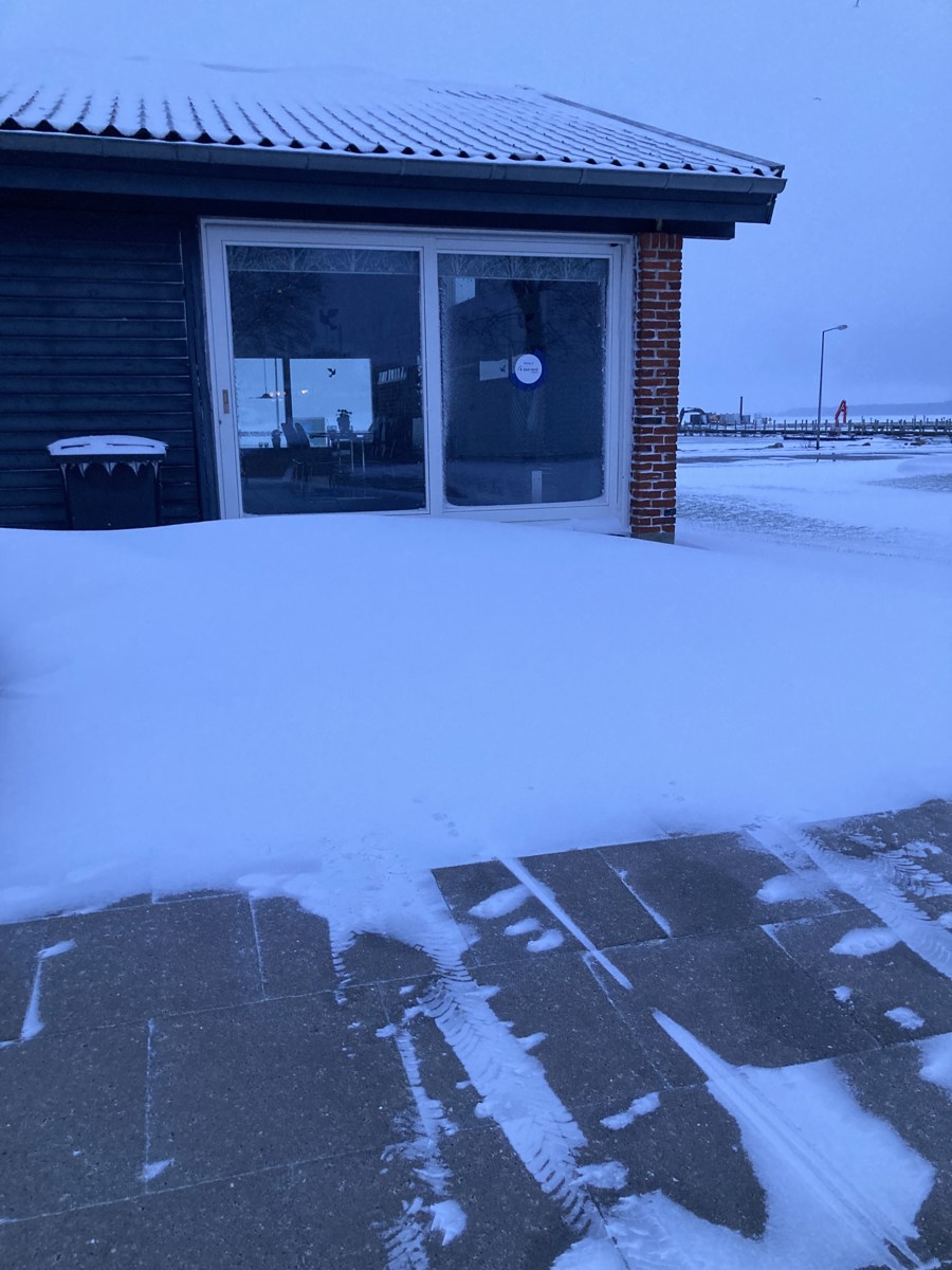 Sneen har lagt sig over land og by - og en del sne af føget sammen ved klubben. Flot ser det ud.